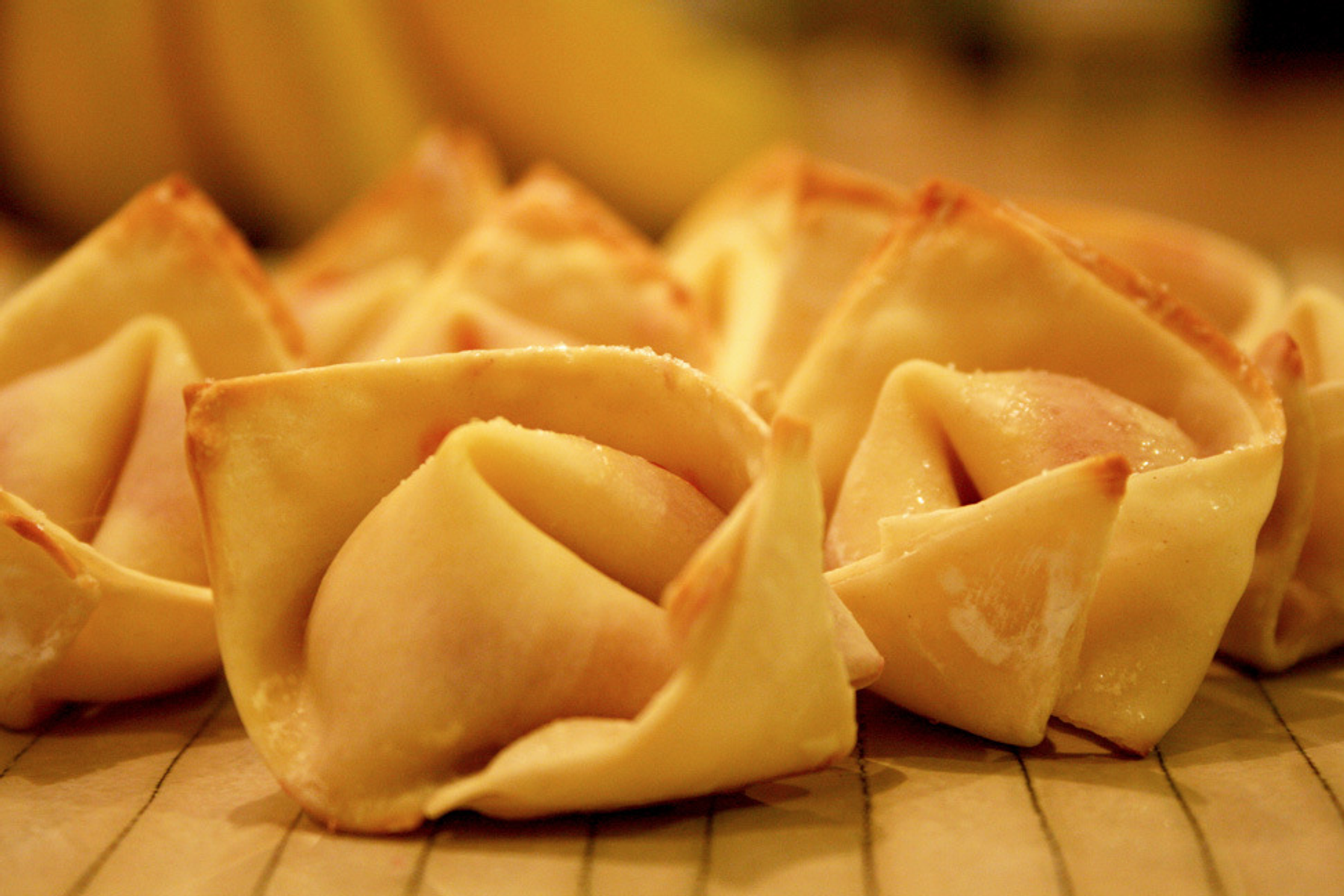 A dessert twist on a common appetizer at Asian restaurants -- crab cheese rangoons. Rangoon wrappers are stuffed with a sweetened cream cheese and raspberry filling for a healthy dessert. Perfect for entertaining or a fun snack on family game night.