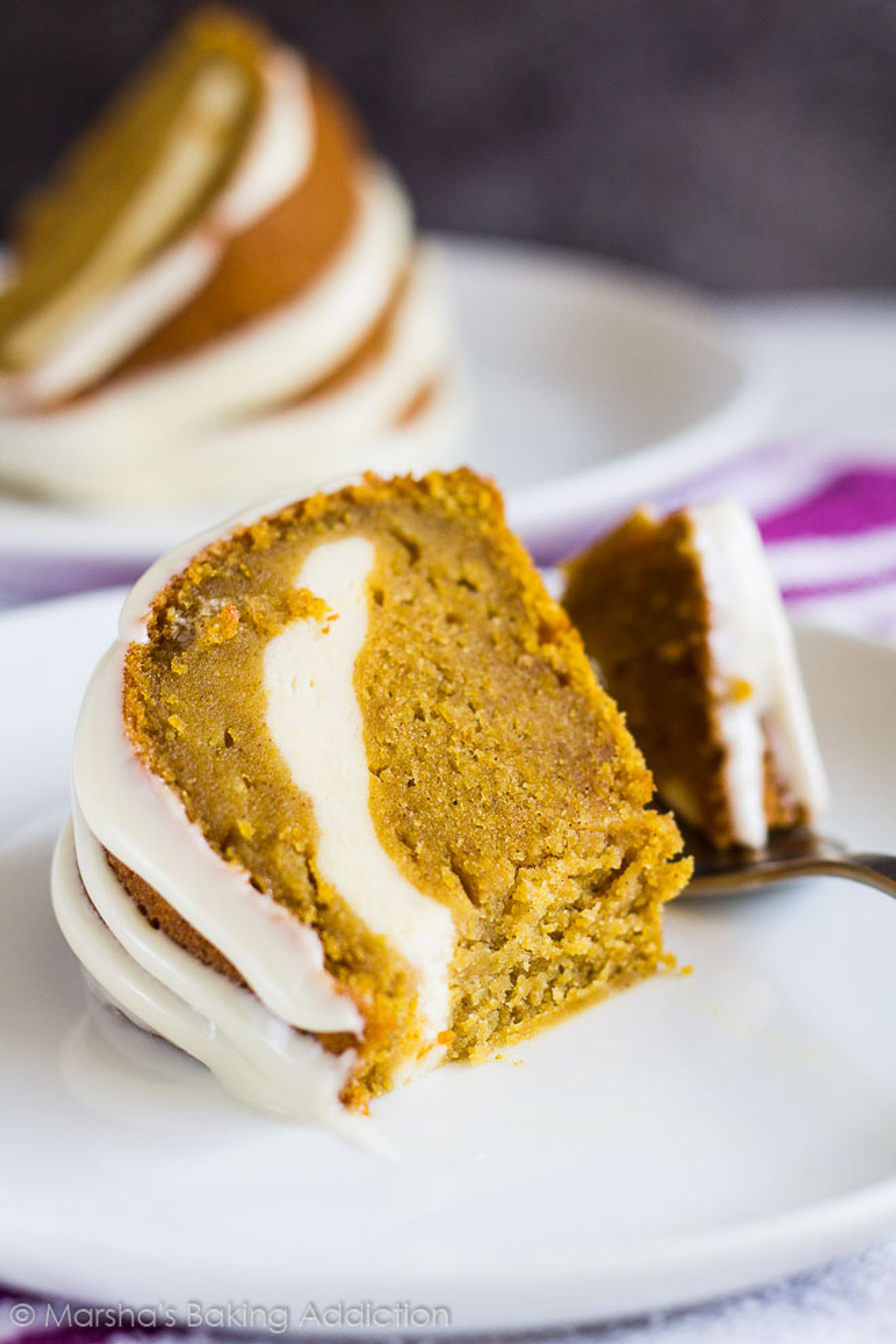 Super moist and delicious spiced pumpkin Bundt cake filled with a layer of vanilla cheesecake, and drizzled with a cream cheese frosting!