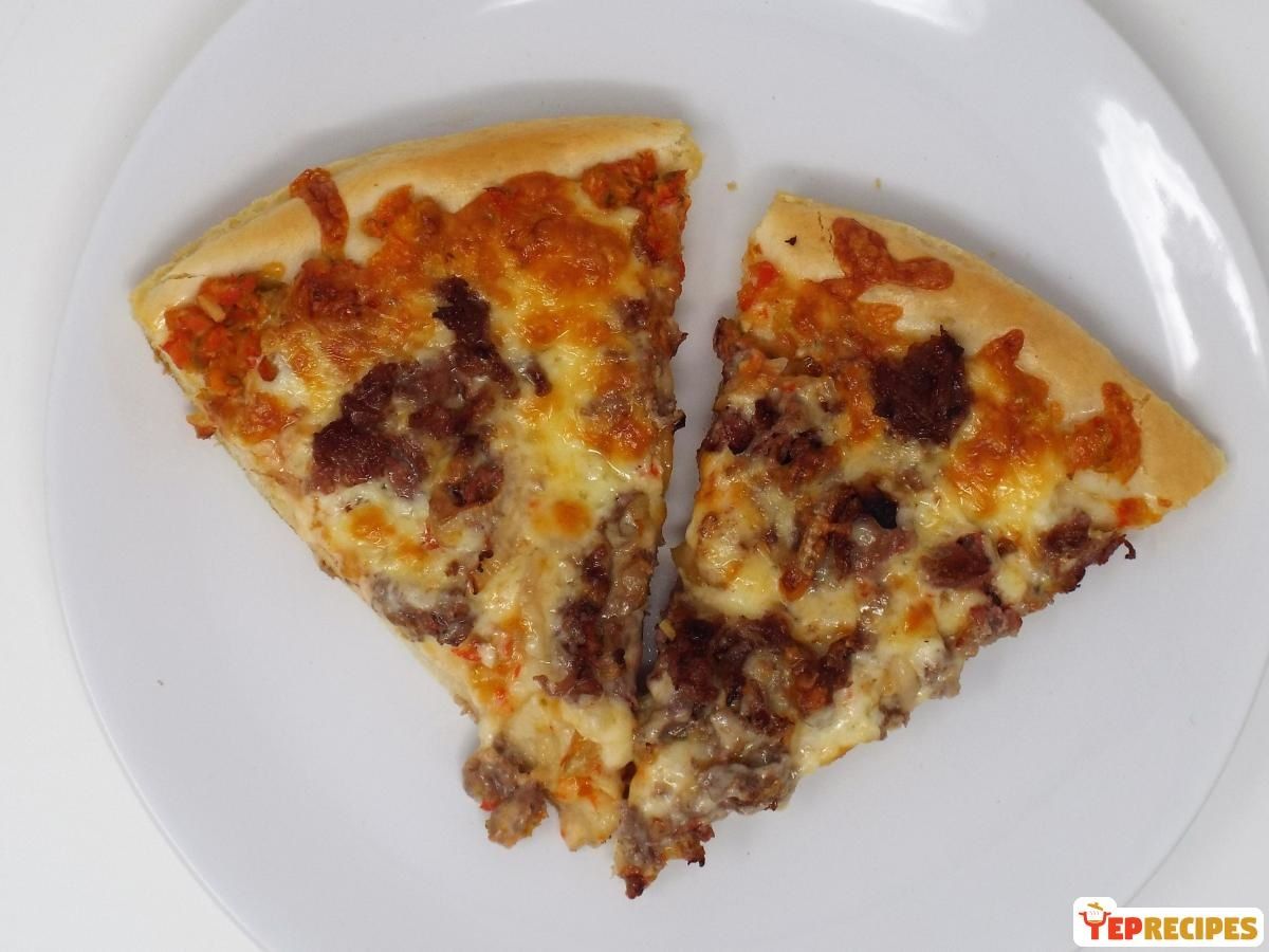 A homemade deep dish pizza crust spread with hot pepper relish and topped with shaved steak, onions, and white cheddar cheese.