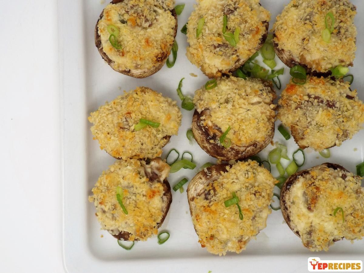Ribeye, peppers, onions, and garlic cream cheese stuffed into mushroom caps and topped with Parmesan breadcrumbs.