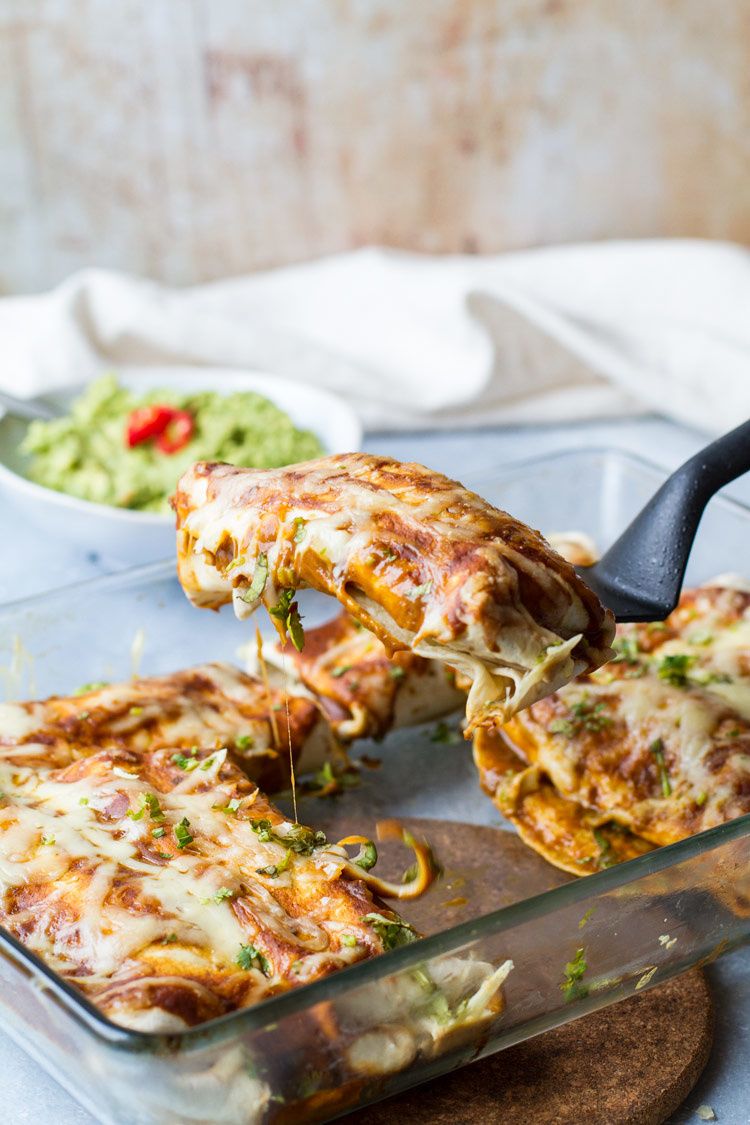 Cheesy beans and beef enchiladas with a homemade enchilada sauce. It's comfort food filled with melting cheese, soft tortillas, bold flavors of chili, cumin and garlic, and topped with fresh sour cream and cilantro or spring onion.