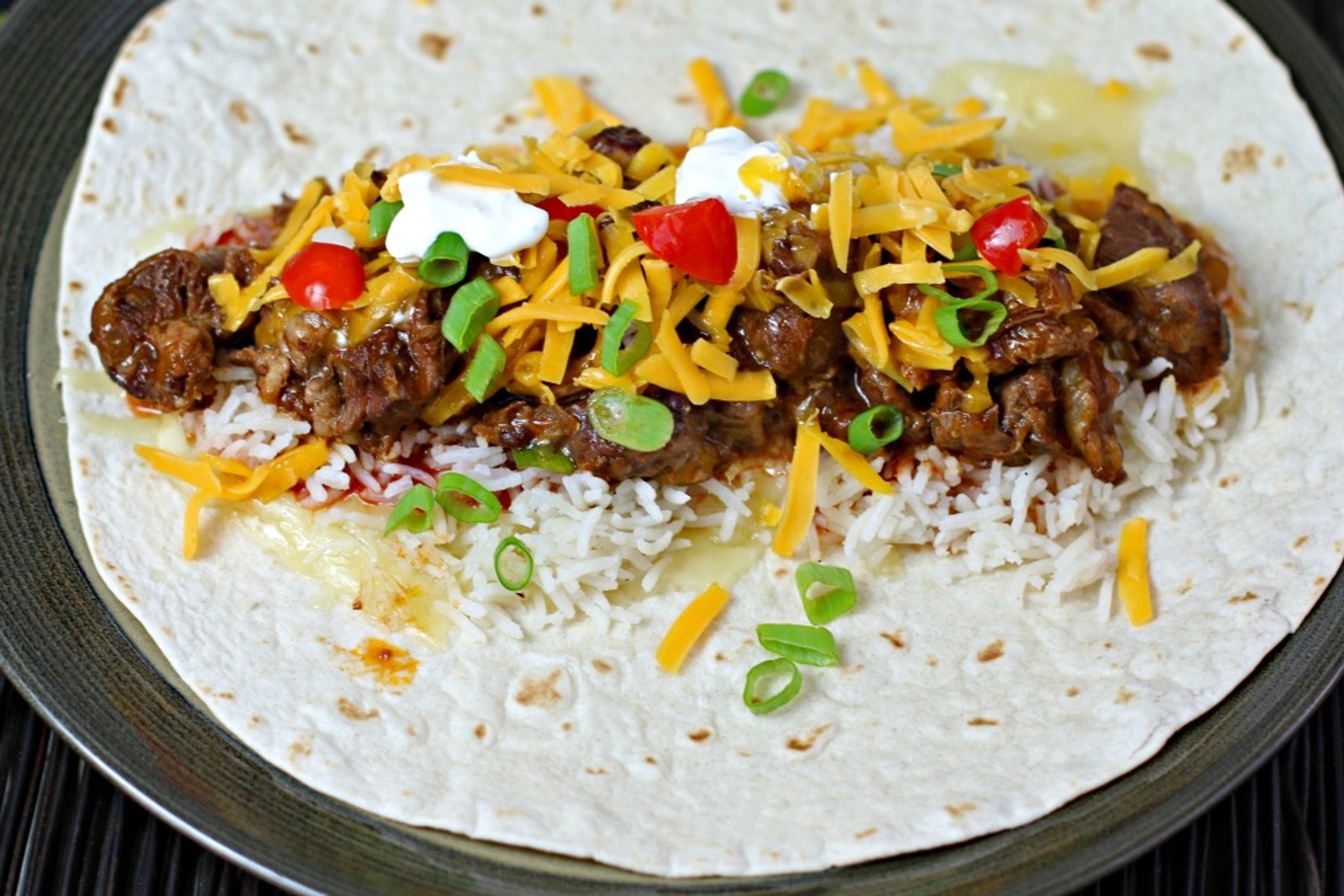 This Cheesy Beef Burrito has the BEST Mexican simmered beef you’ll ever taste! Add other yummy toppings for a delicious family staple!