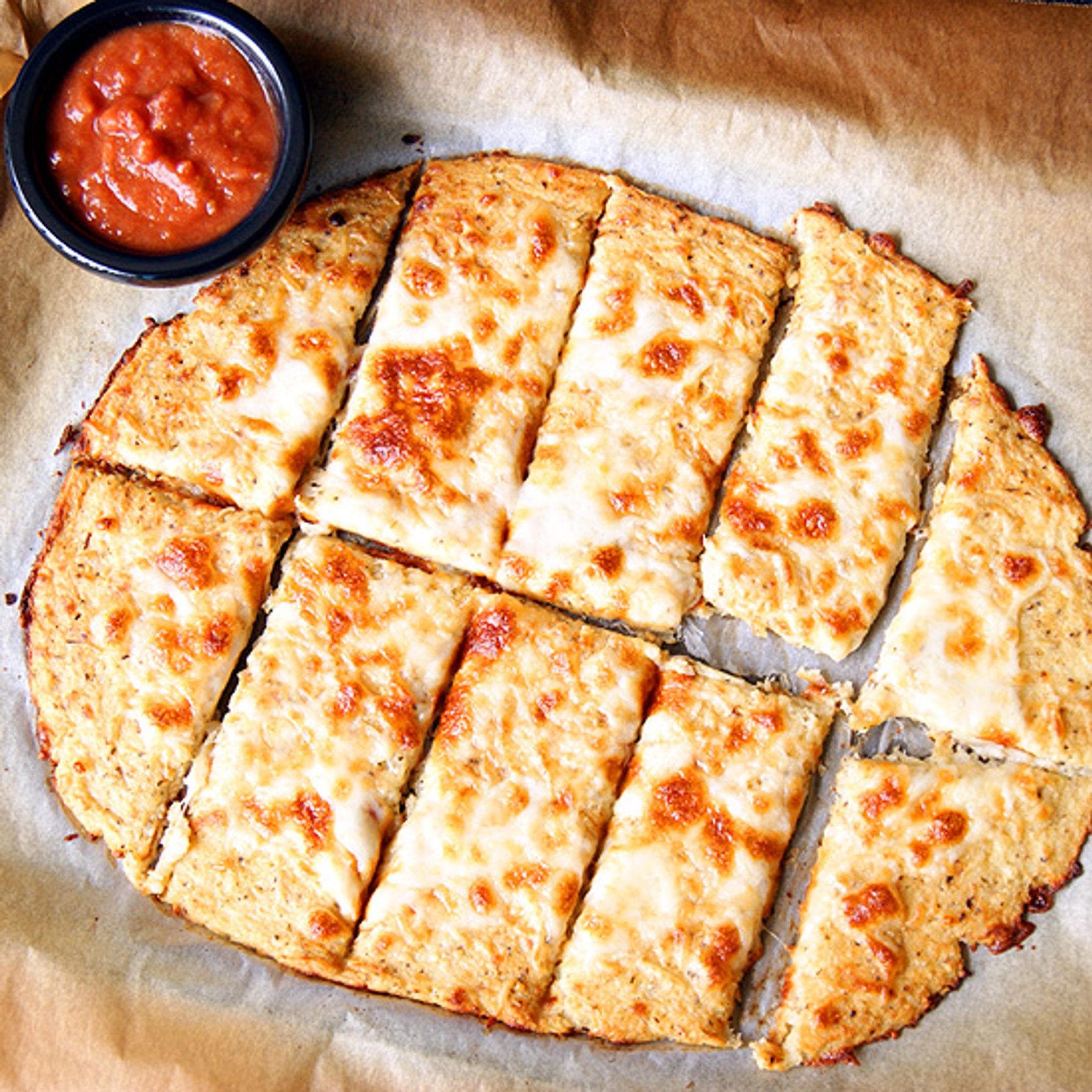 An easy to make and delicious cheesy breadstick made using a crust made from cauliflower florets instead of the regular yeasty cousin.