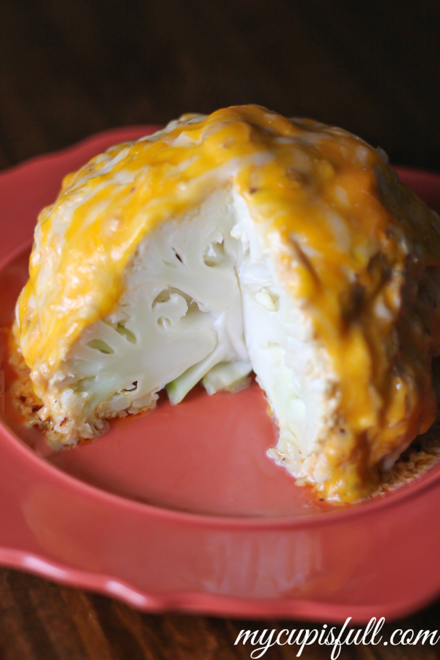 An easy side of a whole head of cauliflower covered in a tangy sauce and cheese.