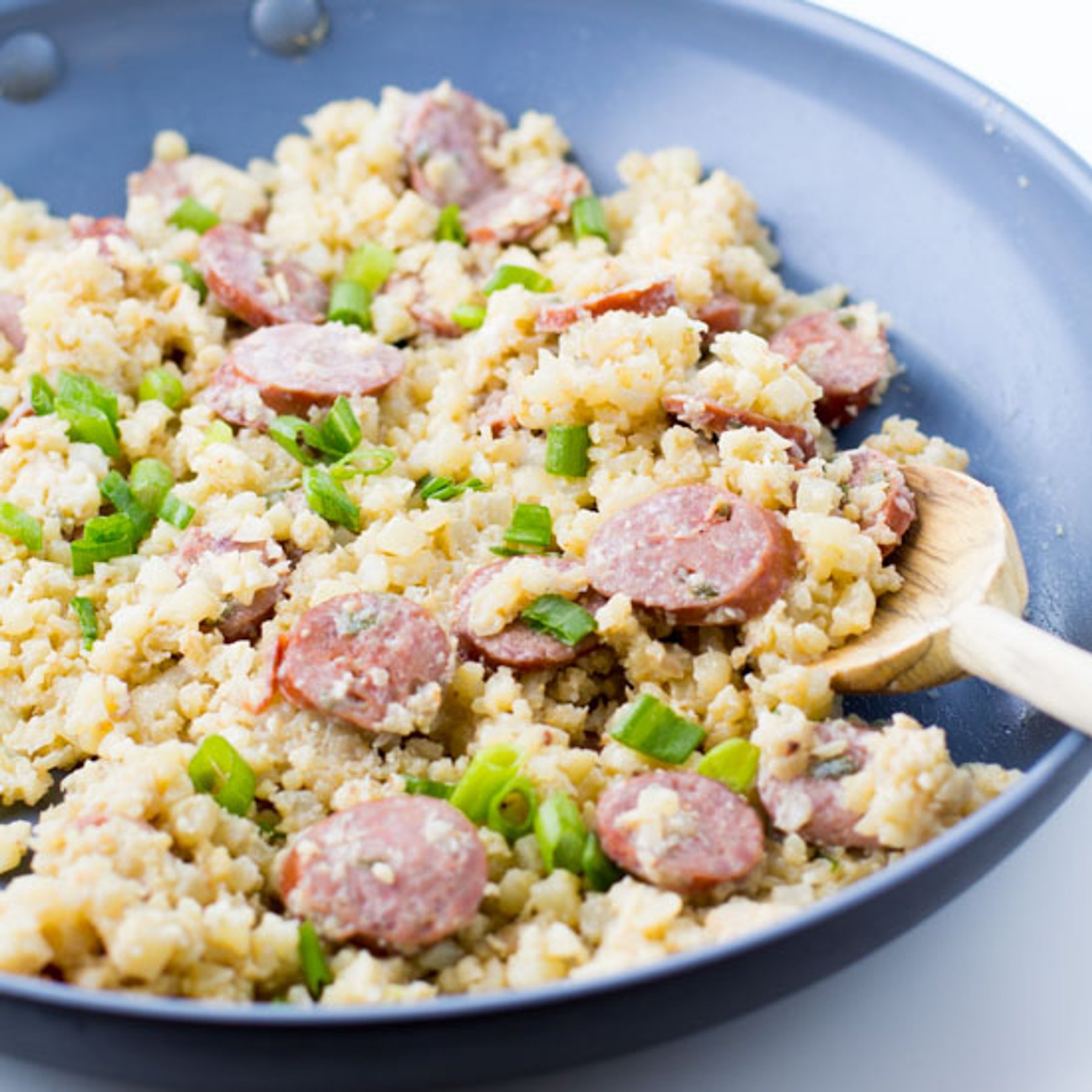 Cheesy Cauliflower Rice & Sausage Skillet – a healthy low carb dinner ready in 10 minutes or less! Gluten Free, Easy