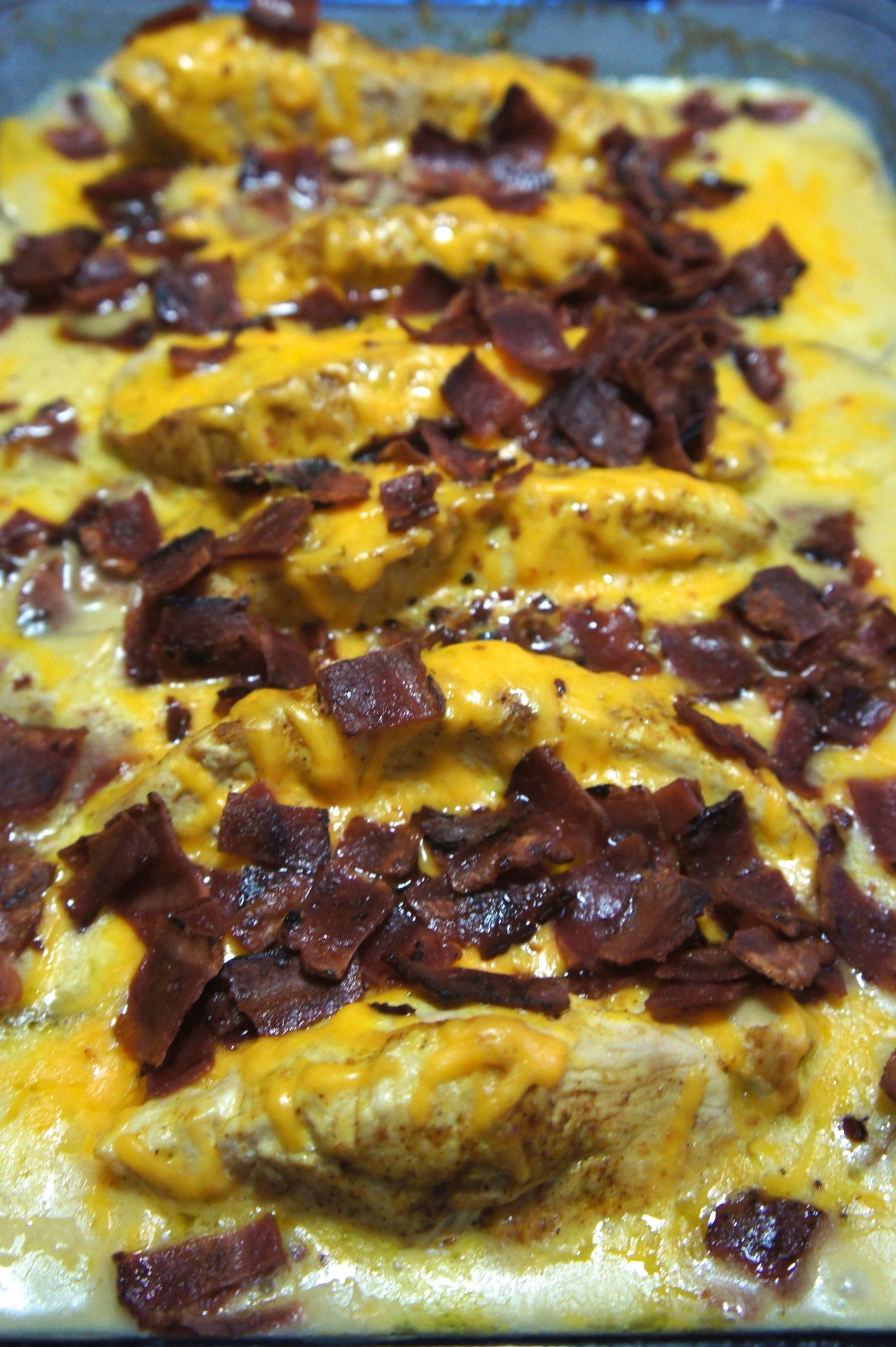 A comforting casserole with thinly sliced potatoes a homemade cheesy sauce topped with chicken, bacon and more cheese.