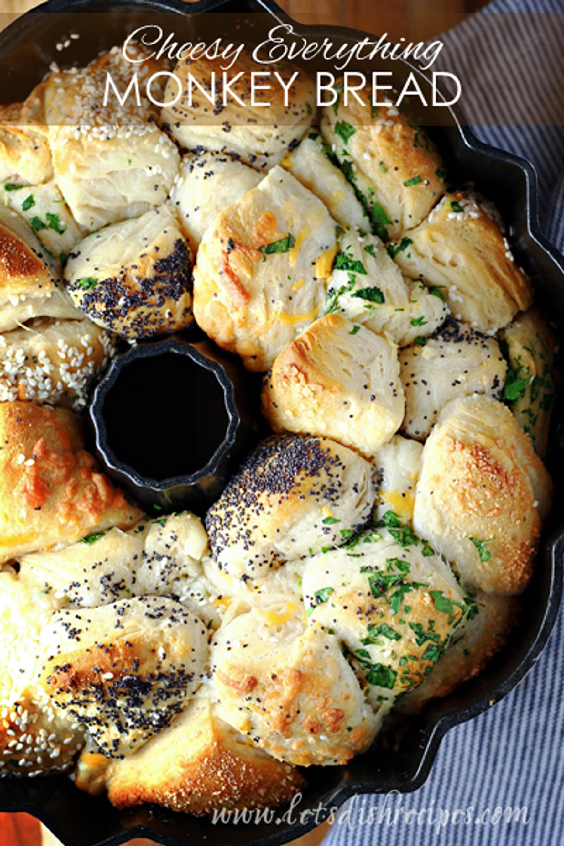 Prepared biscuit dough is coated in everything bagel toppings, along with butter, garlic, cheese and herbs in this savory monkey bread creation.