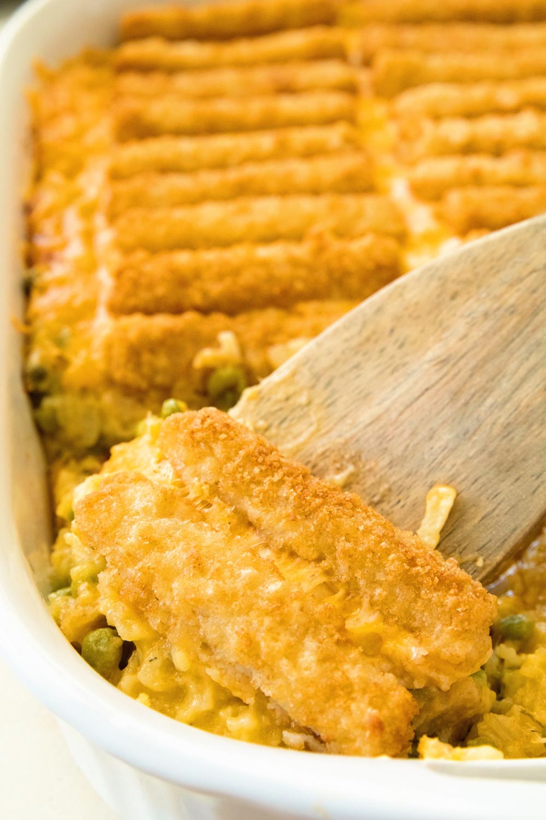Cheesy Fish Stick Hash Brown Casserole Recipe ~ Your Favorite Hash Brown Casserole Topped with Crunch Fish Sticks to Make it a Main Dish Casserole!