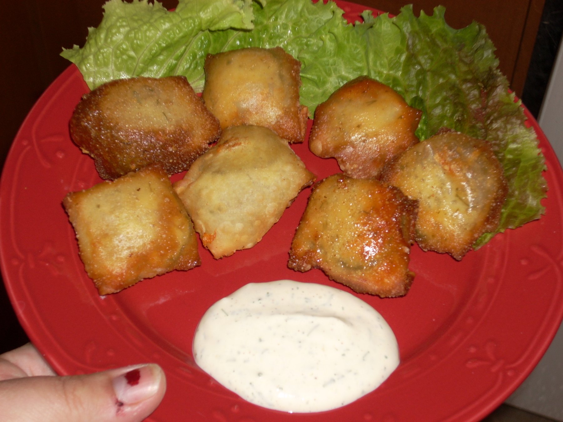 Fry in batches in hot oil, just until golden brown, 1-3 min per side. Drain on paper towels. Serve with extra sauce for dipping.