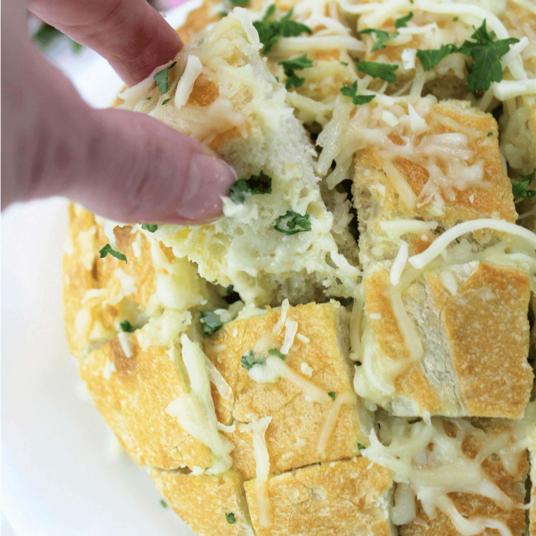 Cheesy garlic pull apart bread with loads of garlic, butter, parsley, and gooey mozzarella cheese