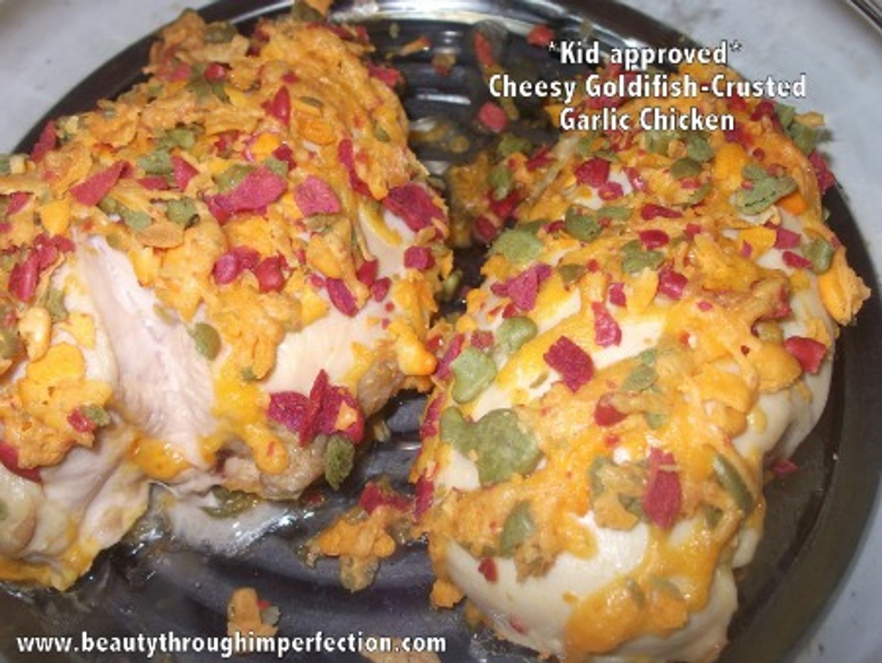 Crack the egg in a small bowl, add the garlic powder and stir. In a separate small bowl mix goldfish pieces and cheese. Dip each chicken breast in the egg mixture, coating the entire...