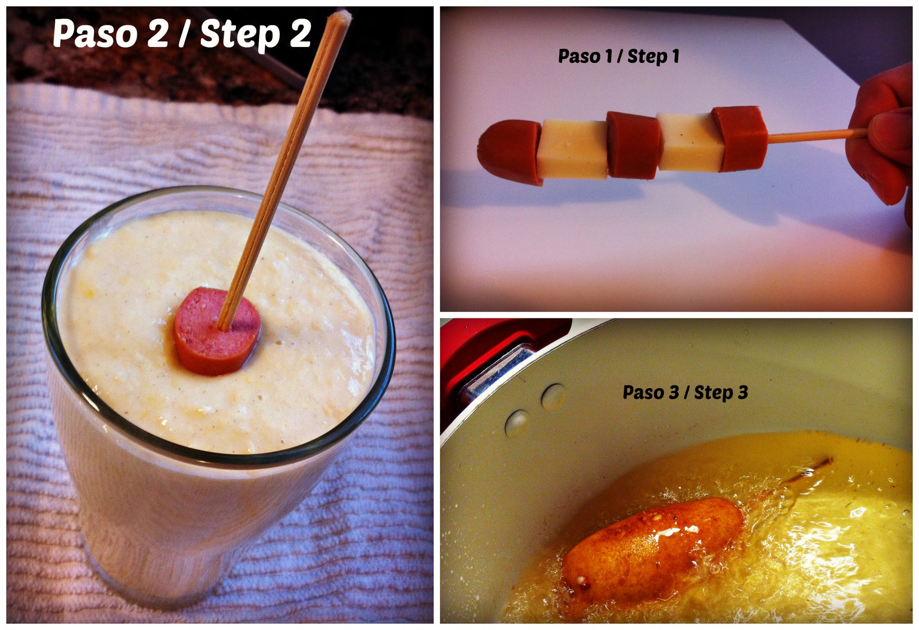 Today I decided to make some corn dogs but I decided to add a twist to make them more fun, healthy, and different from traditional corn dogs, by combining hot dogs and cheese – which kids always seem to love. Of course, if your child doesn’t like hot dogs, you can replace it with an entire cheese stick if you want! In our case, my son loves hot dogs and cheese so I combined them both and he loved them!