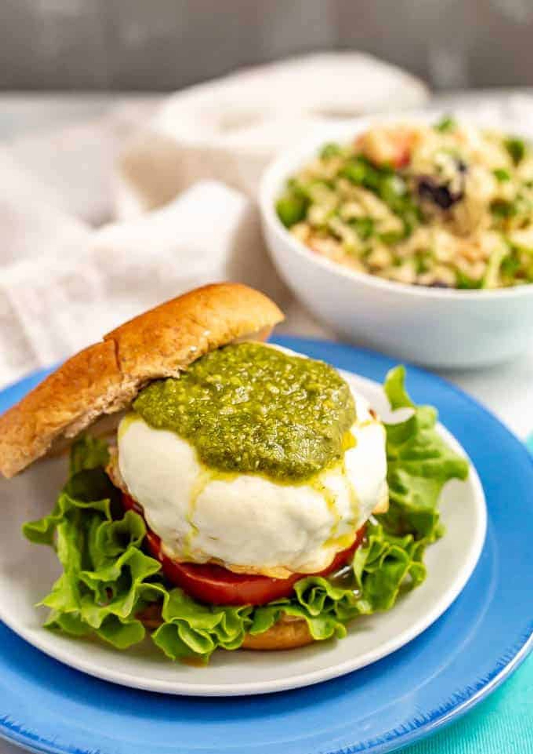 Cheesy Italian chicken burgers are juicy and flavorful with just a few simple ingredients. They are topped with mozzarella cheese for a tasty, easy dinner.