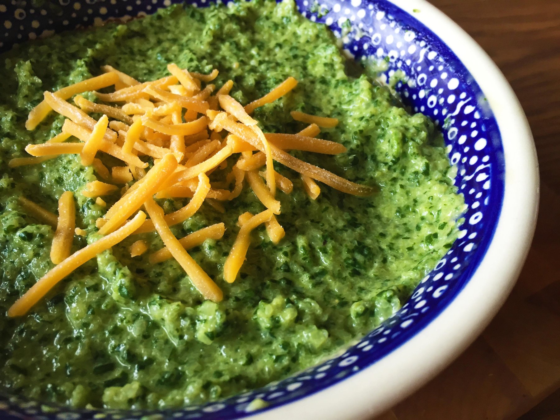 Blend cooked cauliflower and spinach in a food processor until "mashed".