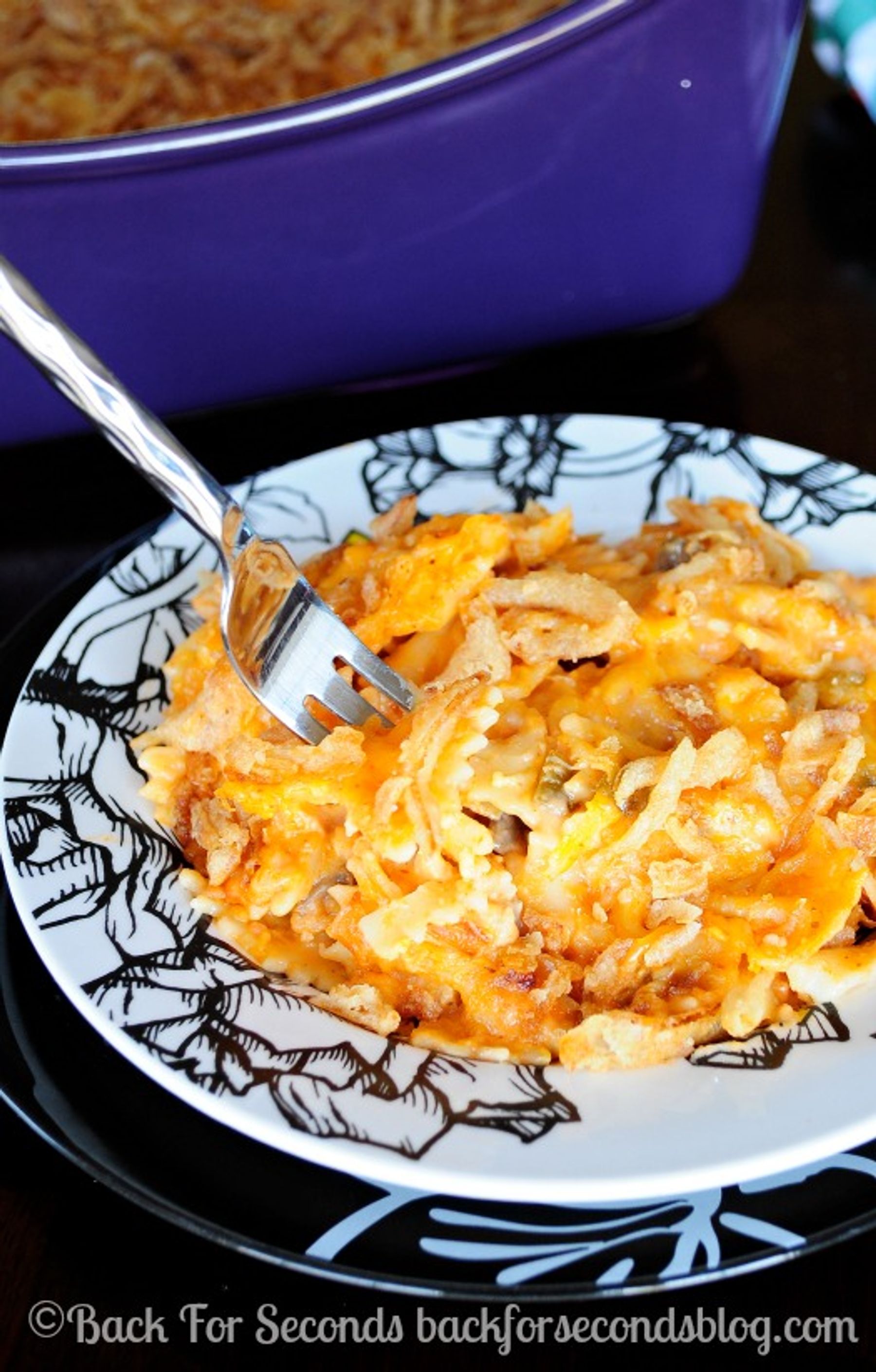 This Cheesy Mexican Bowtie Pasta is total comfort food! Creamy and cheesy with a bit of crunch from the french fried onions, and on the table in 30 minutes!