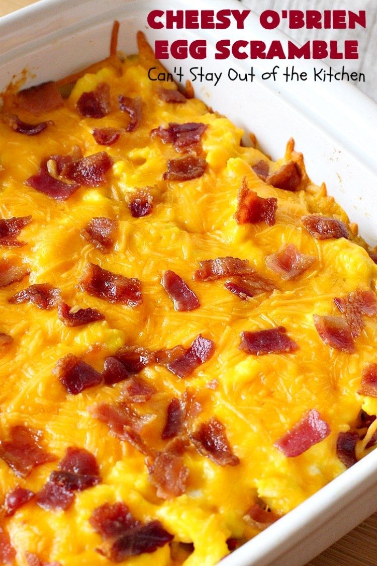 Cheesy O'Brien Egg Scramble includes seasoned O'Brien potatoes, scrambled eggs, 2 kinds of cheese, loads of bacon. Terrific for holiday or company breakfast