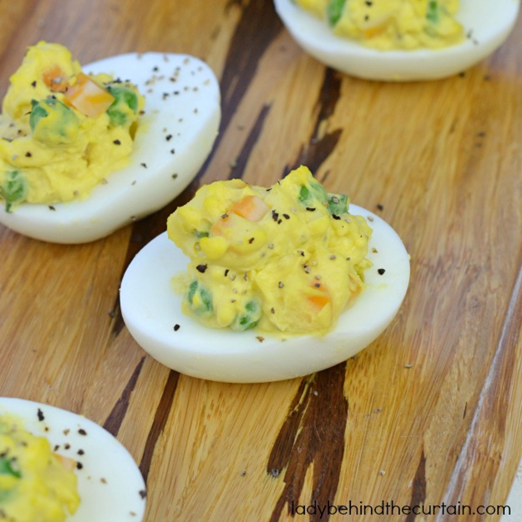 I love Layered Pea Salad and that is exactly what these Cheesy Peasy Deviled Eggs remind me of. I just love the versatility of the deviled egg. Make them as an appetizer for a dinner party or take them on a picnic. Plus, you can add anything to them. Like these Cheesy Peasy Deviled Eggs. You still get the tangy flavor you love but with little bits of cheese and petite peas. My Easter table is not complete without deviled eggs. This year I think I’ll serve these instead of the traditiona