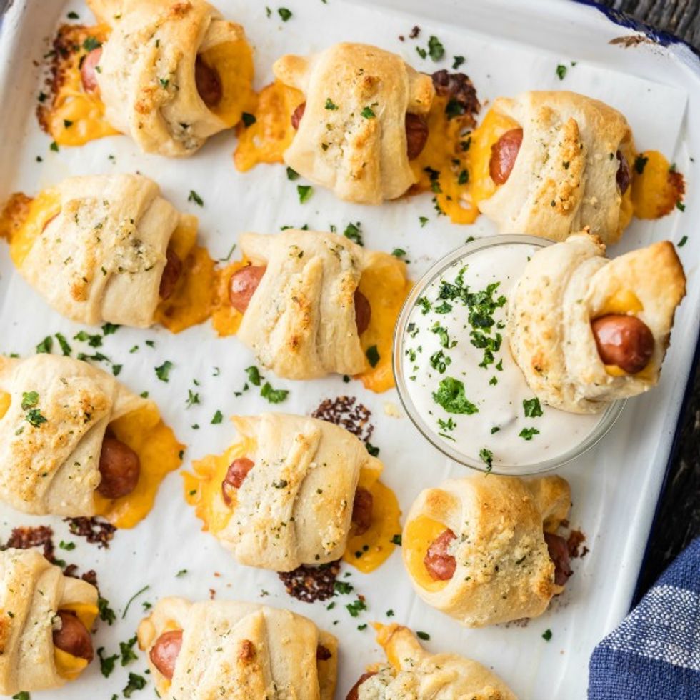These CHEESY PIGS IN A BLANKET with RANCH PARMESAN BUTTER will be all the rage at your next party. They’re easy, fun, and oh so delicious. Lil’ Smokies wrapped in sharp cheddar, crescent roll dough, and brushed with parmesan ranch butter are sure to be a hit.