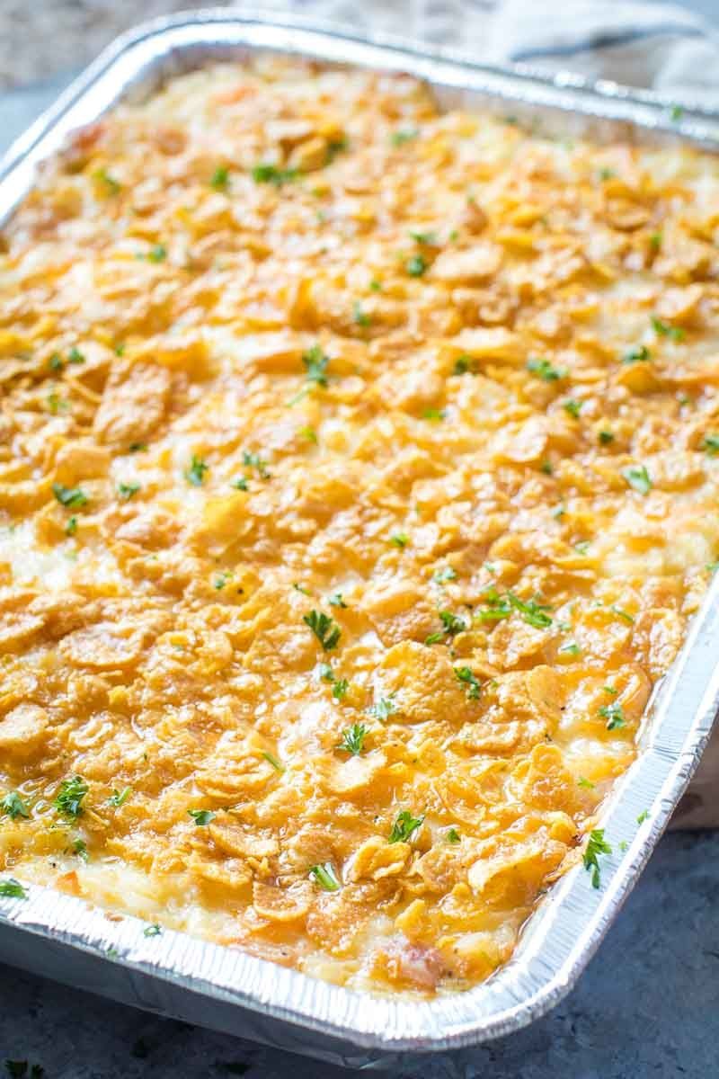 This classic Cheesy Potato Casserole is taken to a whole new level when you make it on your electric smoker! This delicious potato casserole is made with hash browns and topped with a buttery Corn Flake topping then smoked for the ultimate flavor on your Traeger pellet grill. If you are looking to make a holiday meal on your smoker this needs to be on your menu!