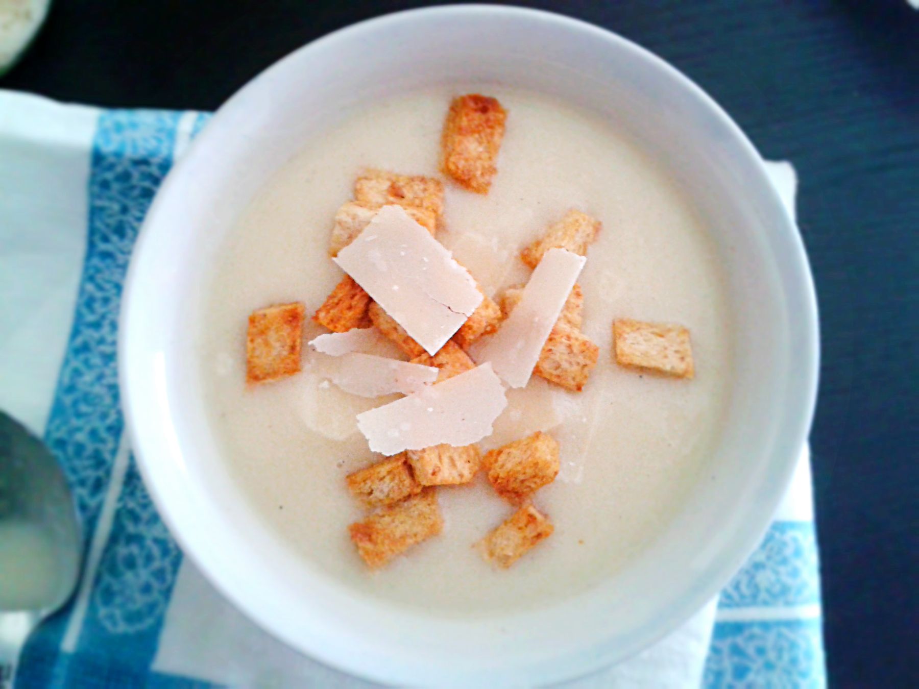 For garnish you will need parmesan flakes, homemade croutons and edam or gouda cut in small cubes.