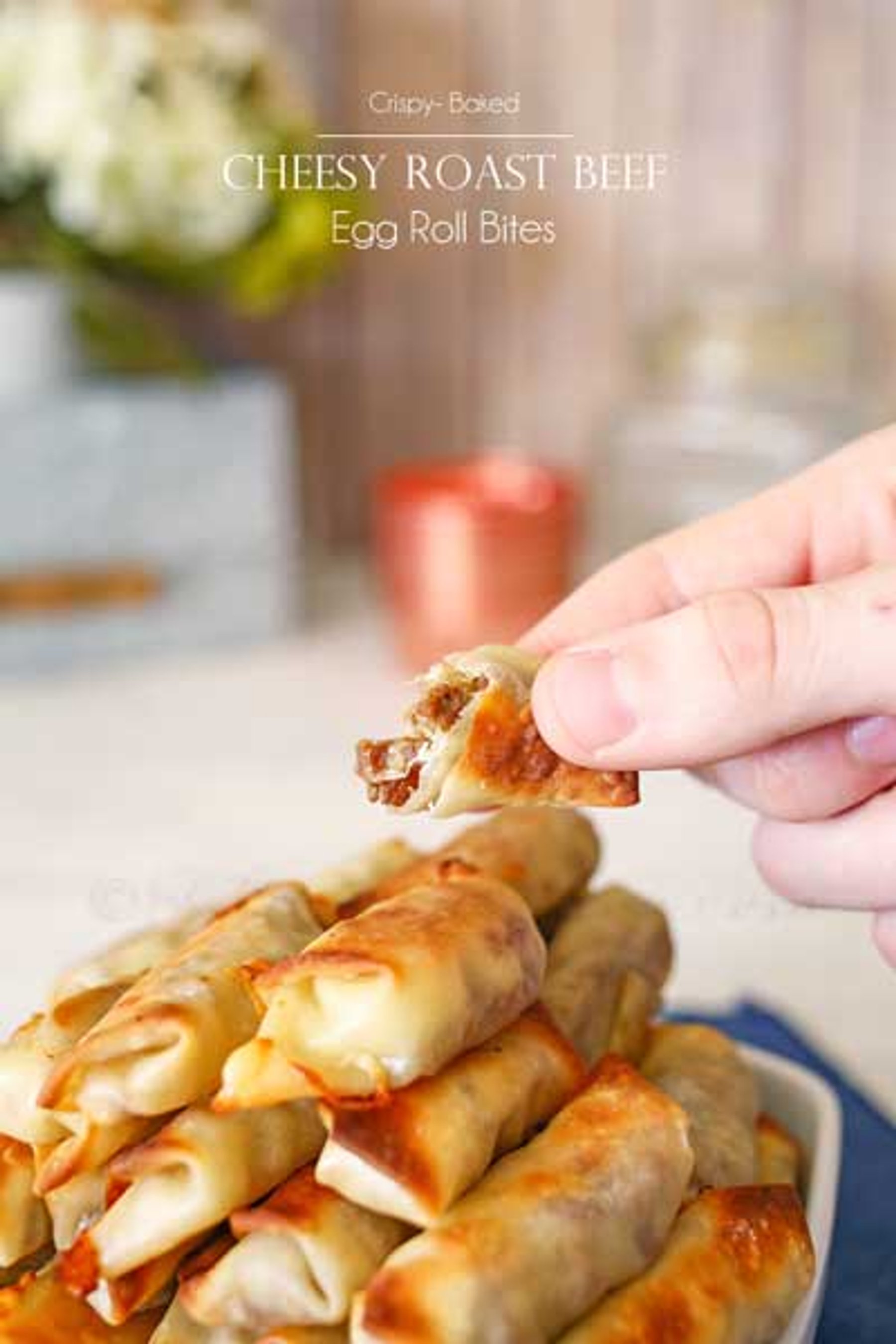 Mini egg rolls made with cheese & roast beef - baked, not fried & oh so delicious.