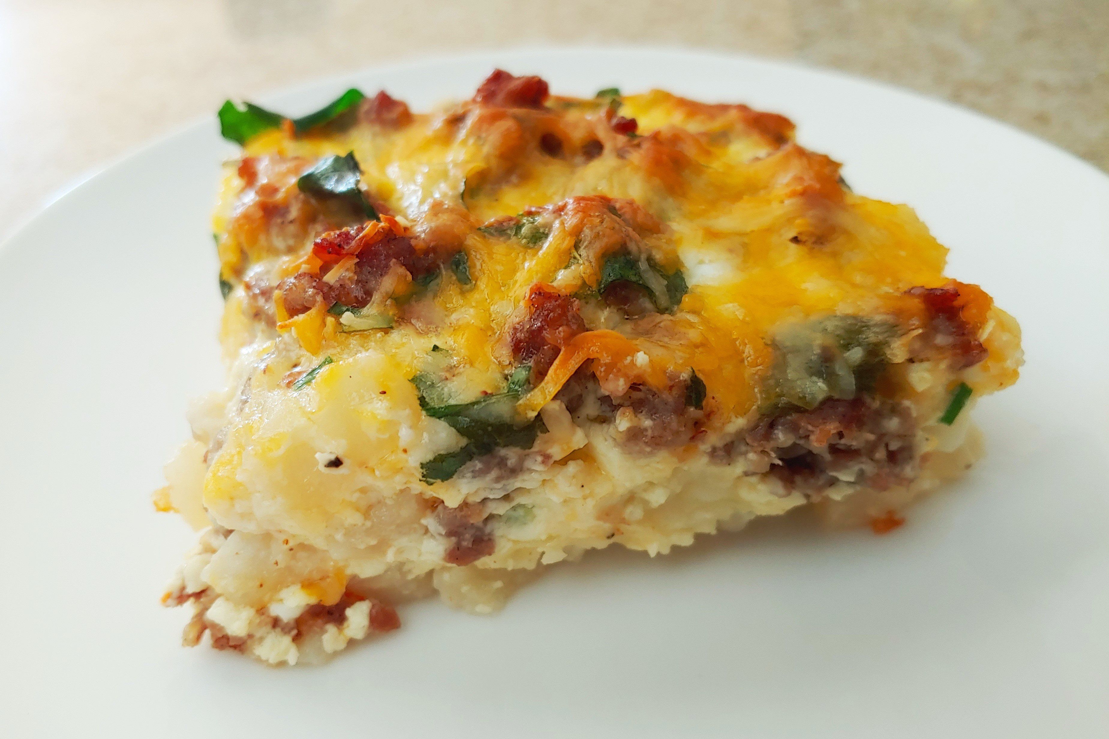 Cheesy Sausage Breakfast Casserole is a perfect breakfast bake made with eggs, sausage, cheddar, baby spinach, and potatoes o'brien. It's a meal the whole family will love!