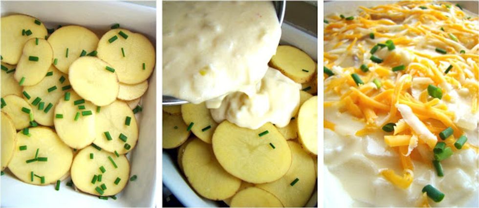 Next, I sprayed a deep 9x9 ceramic casserole dish with some cooking spray. A single layer of potato slices was layered in the bottom of the dish, followed by a sprinkling of snipped chives. Another layer of potato came next, followed by more chives. I continued like this until the potatoes were used up.