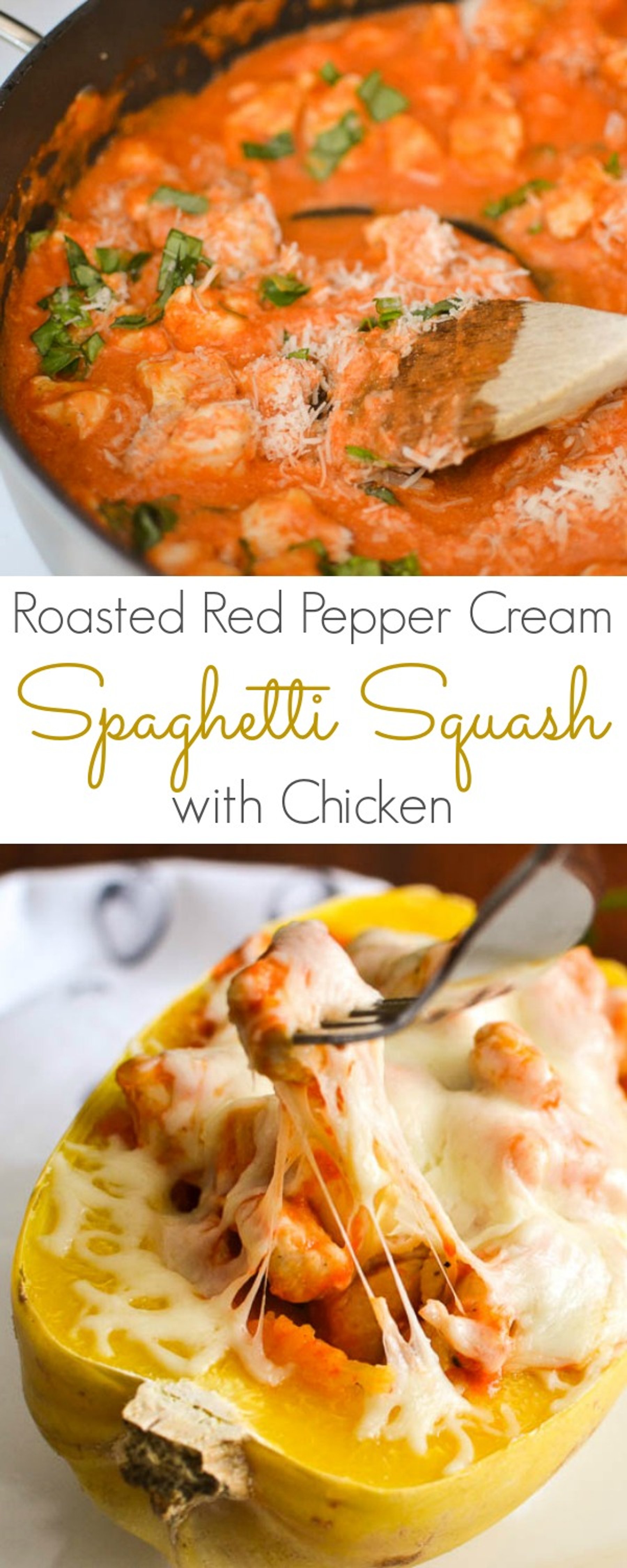 Cheesy Spaghetti Squash Boats with Chicken & Roasted Red Pepper Cream Sauce