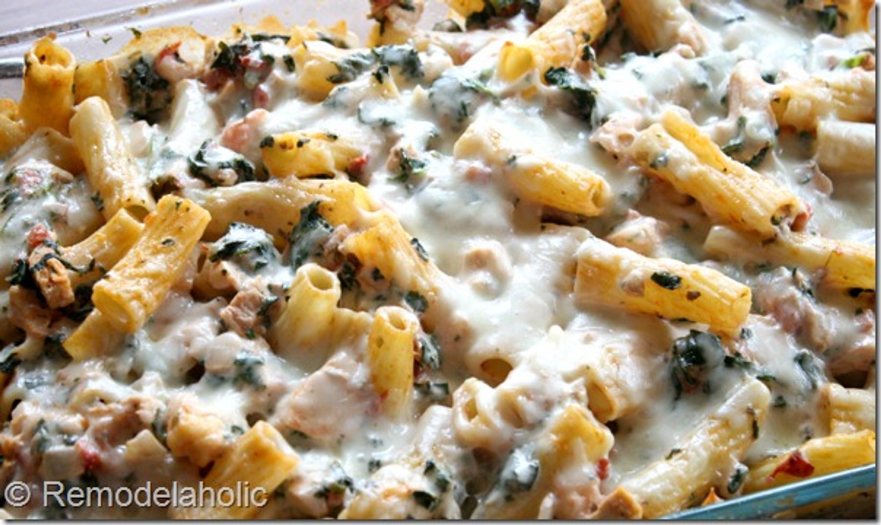 Need a cheesy pasta bake that will please a crowd! Try this wonderful casserole full of all things delicious, chicken, spinach, tomatoes and cheese. This is a great freezer meal too!