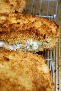 Pork chops stuffed with three kinds of cheese and spinach, then coated in panko and bake to crispy perfection.