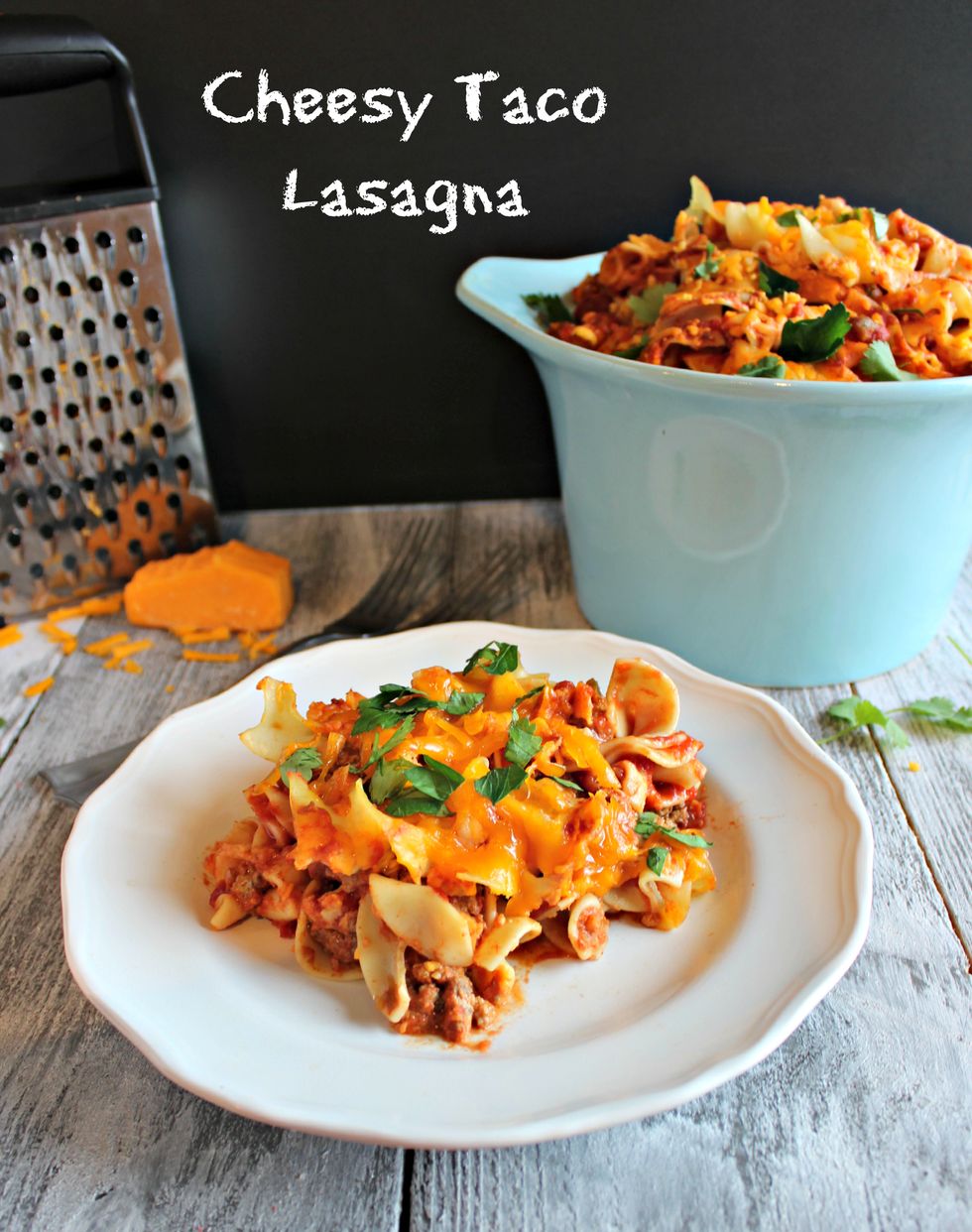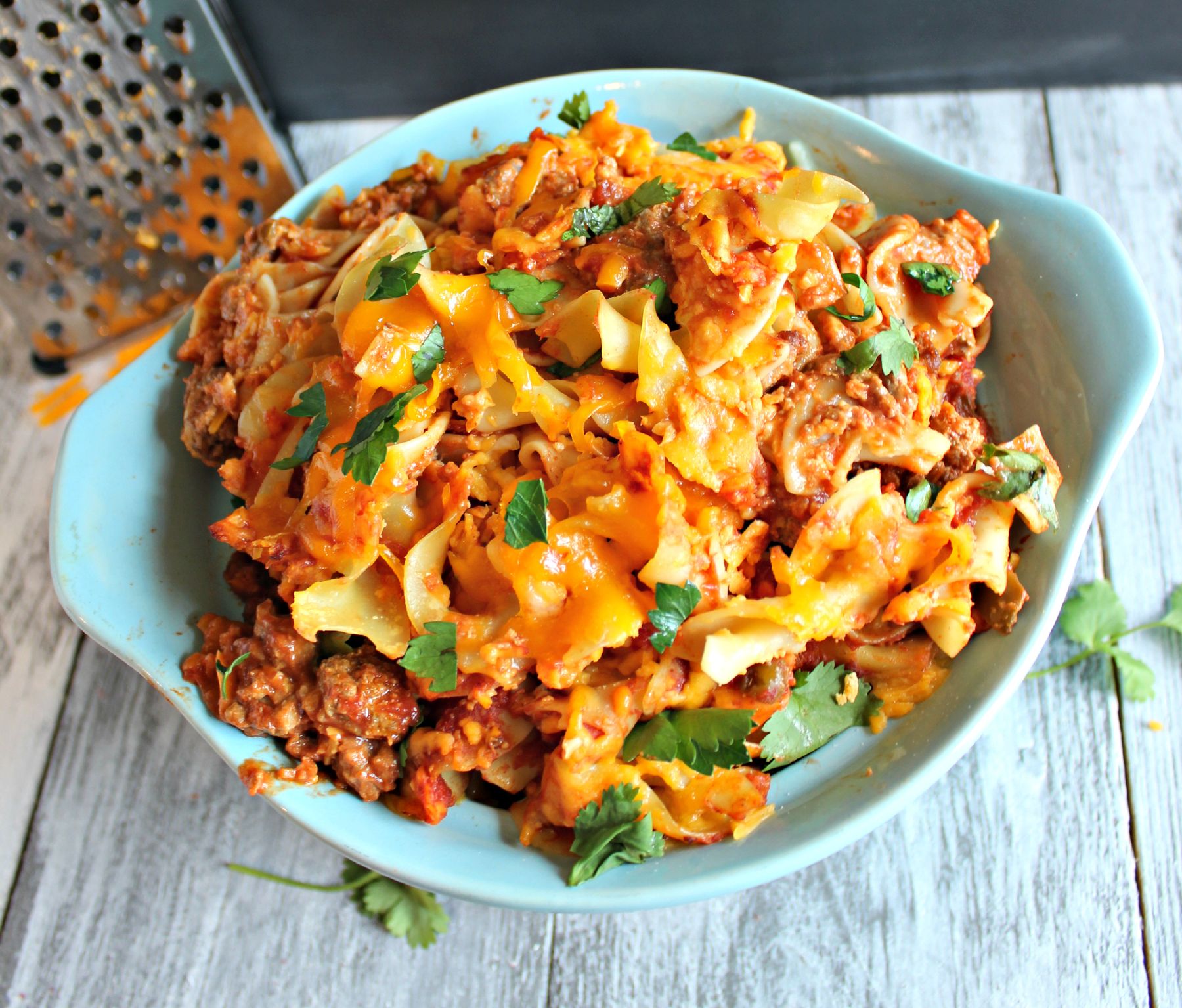 Taco-seasoned lean ground beef with salsa and hot sauce in between layers of curly egg noodles smothered by melty cheddar cheese.