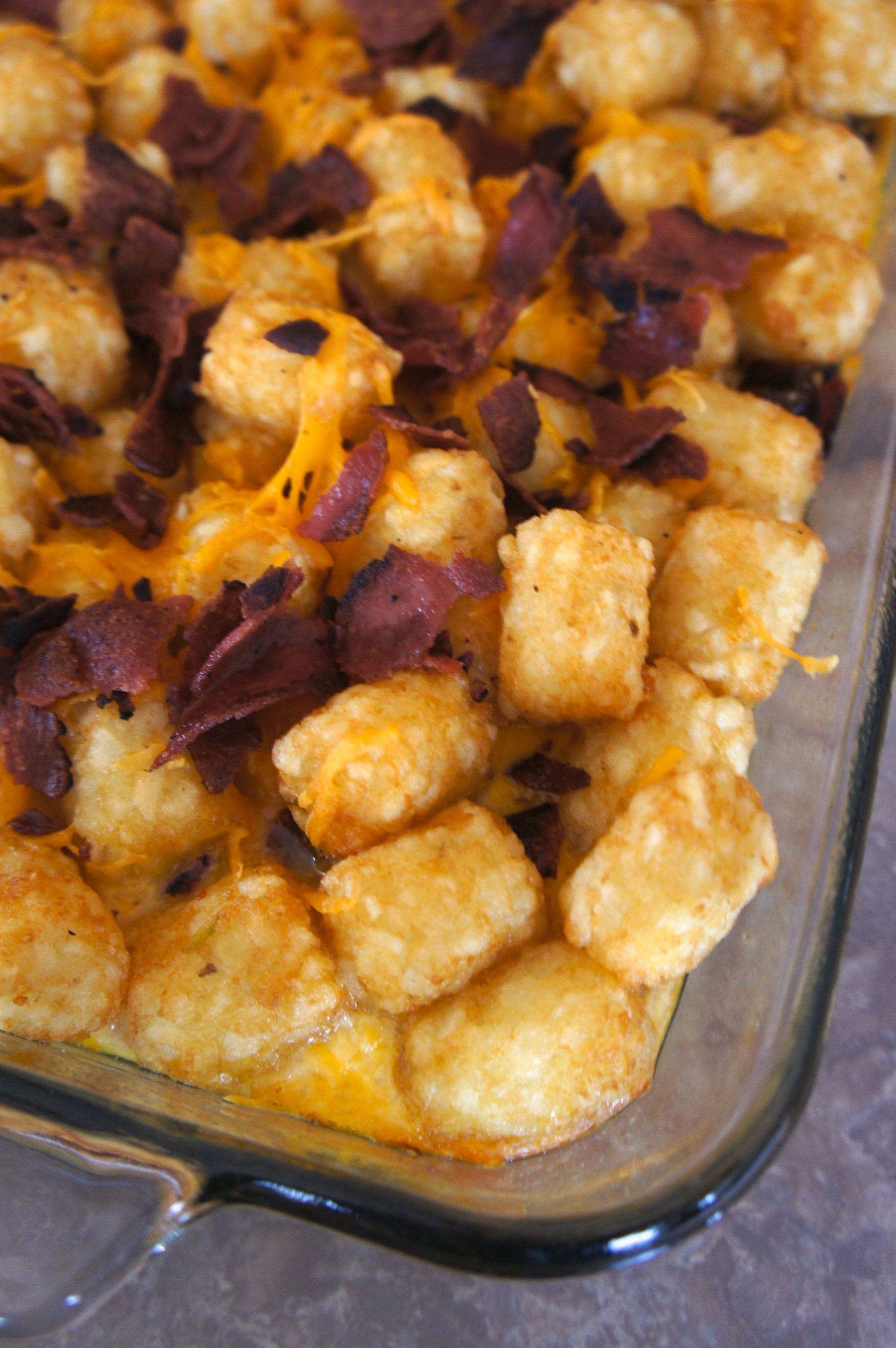 Tater tots, sausage, bacon, cheese and eggs come together in this delicious breakfast casserole.