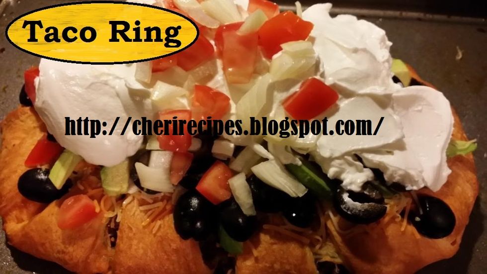 This is a hearty Taco Ring filled with meat and cheese and then topped with lots of your favorite Taco Veggies, and sour cream. You can add salsa, guacamole if you like and this makes such a pretty Dish!! Enjoy Good Food