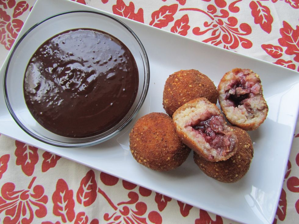 Cherry Almond Arancini (Fried Rice Pudding) with Chocolate Dipping Sauce