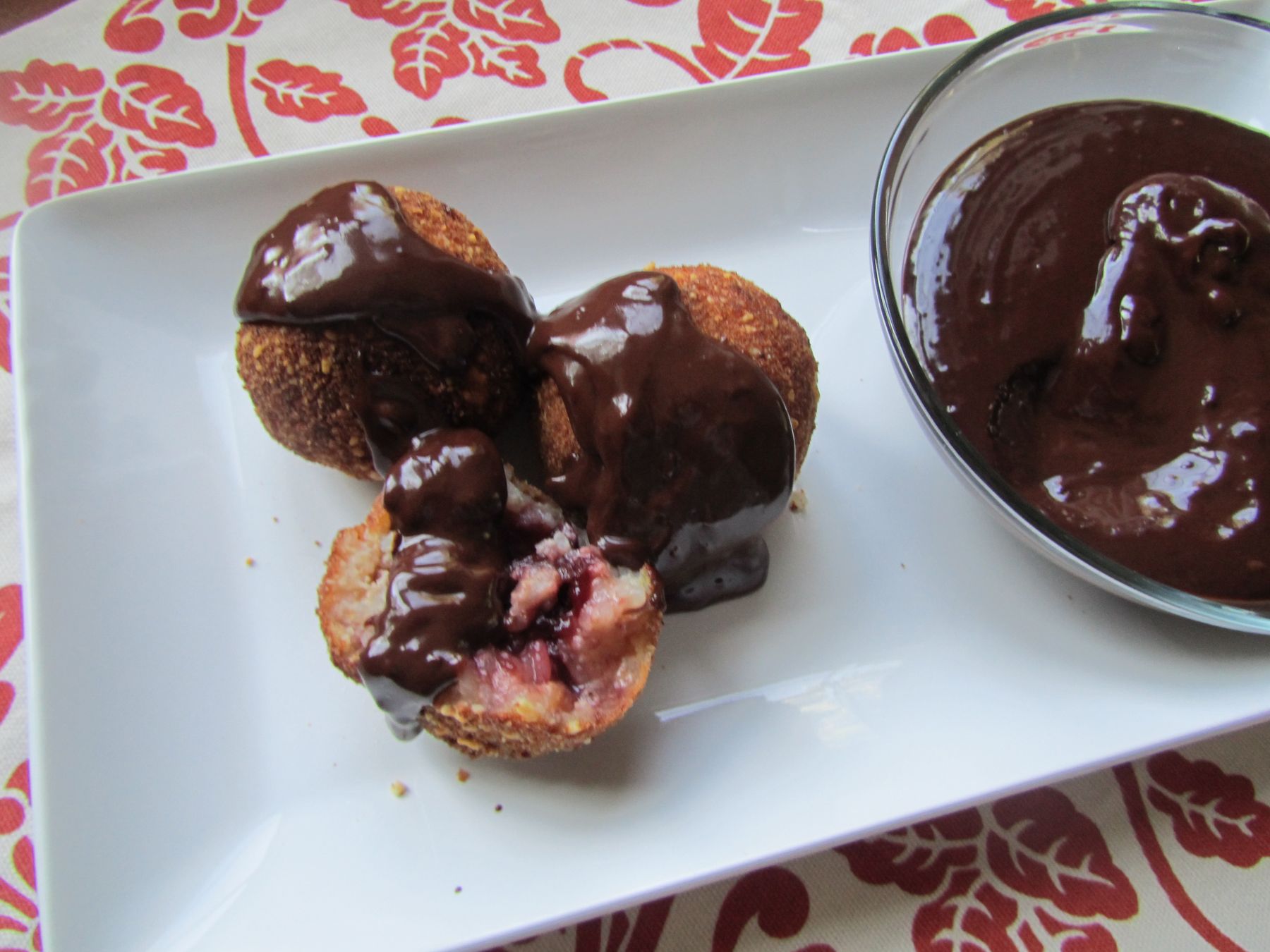 Cherry Almond Arancini (Fried Rice Pudding) with Chocolate Dipping Sauce