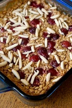 Cherries and almonds are combined in the warm a filling baked oatmeal.
