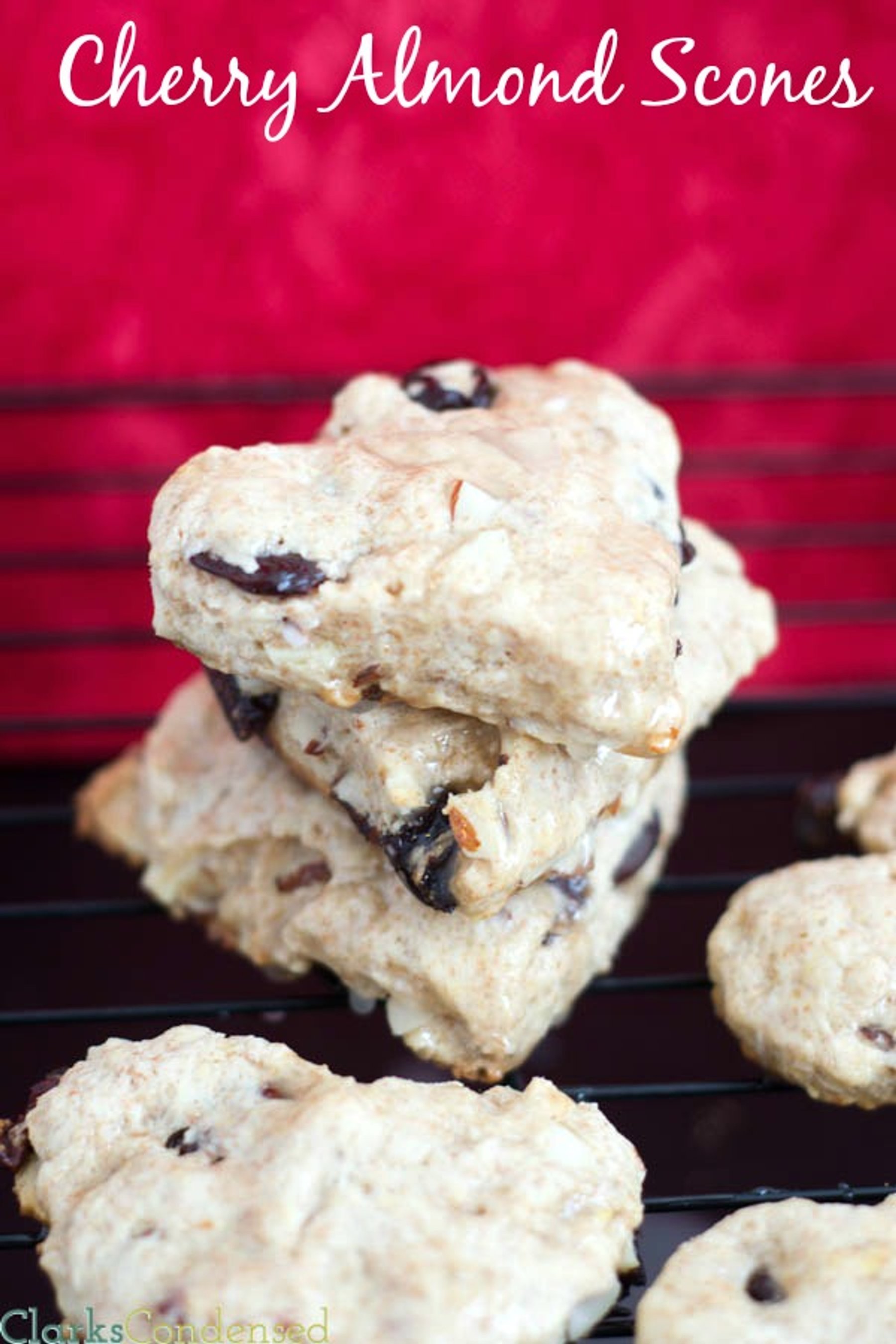 Deliciously sweet scones with almond slices and dried cherry halves. It is very hard to eat just one.