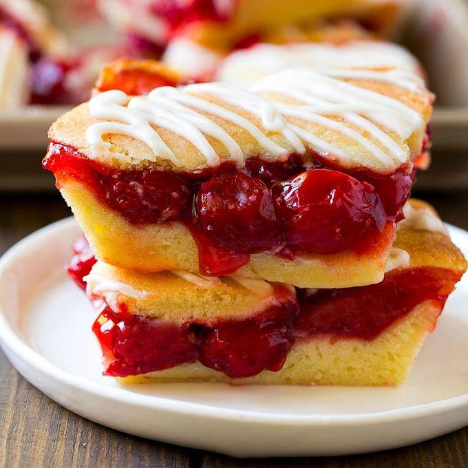 These cherry bars are a soft cookie crust topped with cherry pie filling, more cookie dough and a drizzle of vanilla glaze. An easy and impressive dessert that's perfect to feed a crowd!