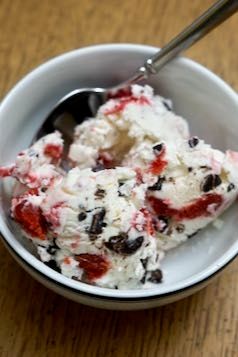 Creamy Cheesecake Ice Cream with a tart cherry sauce and dark chocolate.