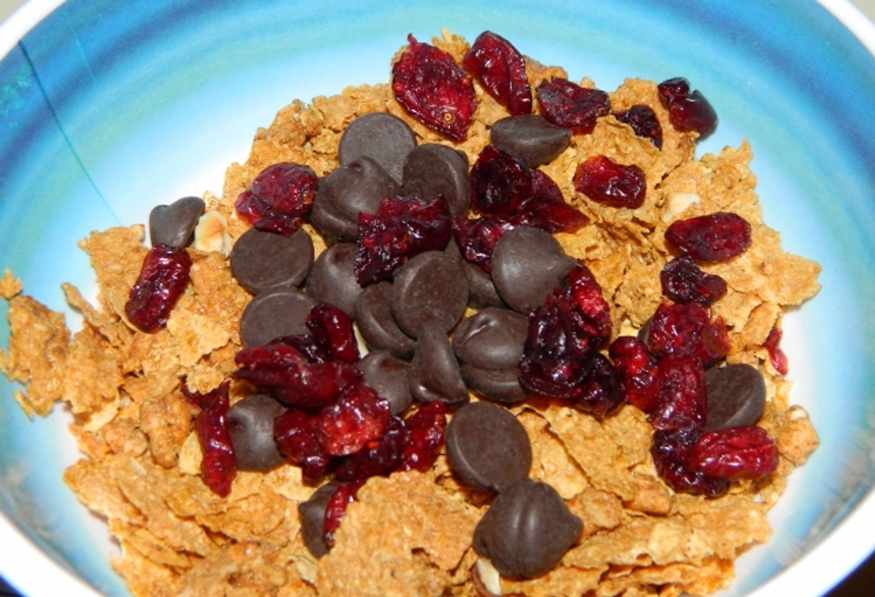 Mix together cereal, chocolate chips and cherries and enjoy!!