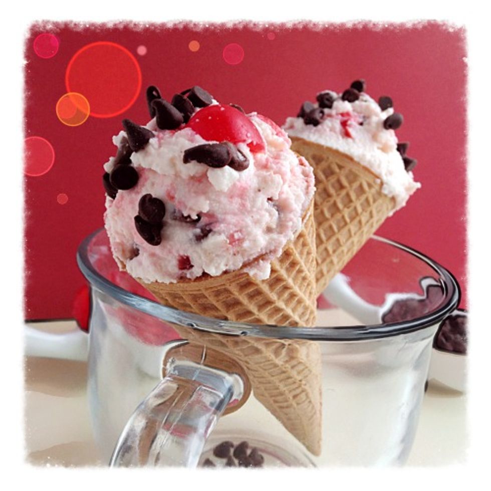 A mock cannoli! A mixture of ricotta, cherries, and chocolate chips filled into store-bought sugar cone.