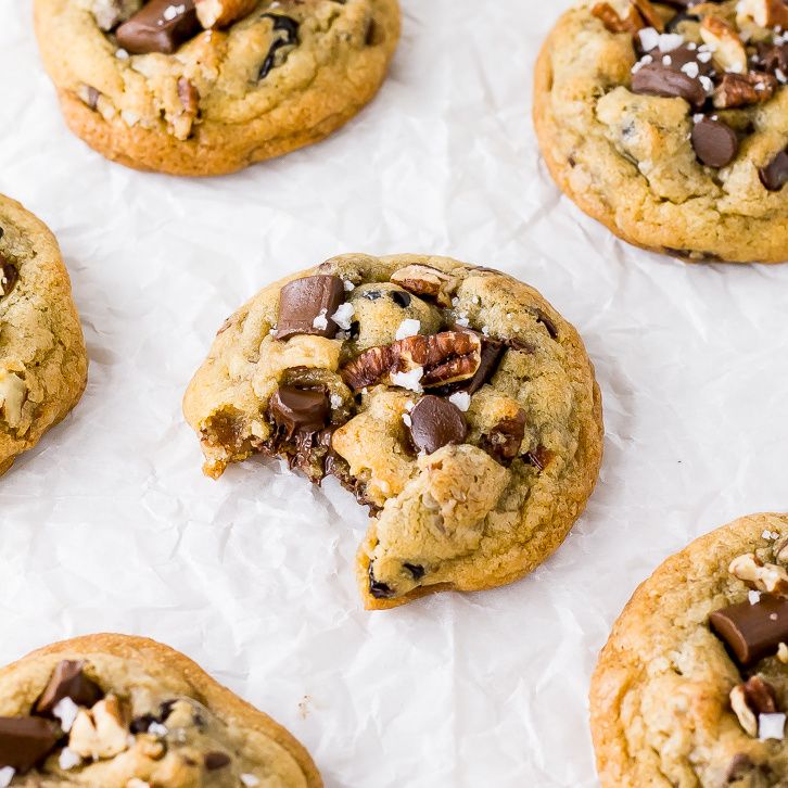 These cherry chocolate chip pecan cookies are thick and chewy, with a little bit of crunch. A combination of dried cherries, dark chocolate chips, chopped pecans, and flaky sea salt means there's lots to love!