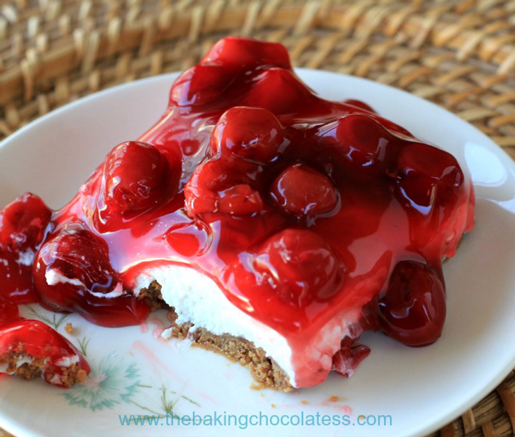 Perfect anytime of the year! Creamy cheesecake delight topped with yummy cherry pie filling and a tempting Biscoff cookie graham cracker crust that will make you want to start celebrating early!