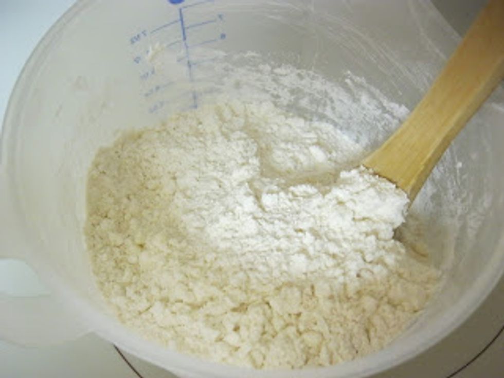 Preheat oven to 425 F. Mix flour, sugar, salt, and baking powder.