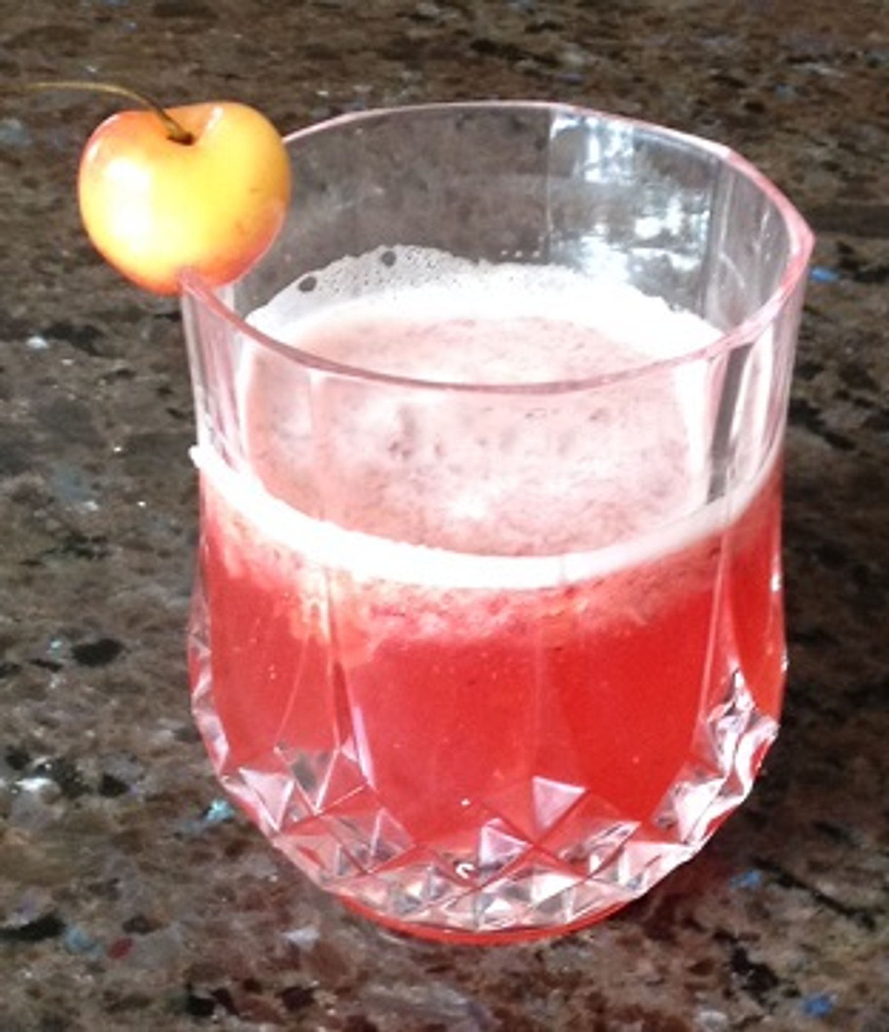 Garnish with remaining 1 cherry by making a cut at the bottom of the cherry and hang it on the glass rim.