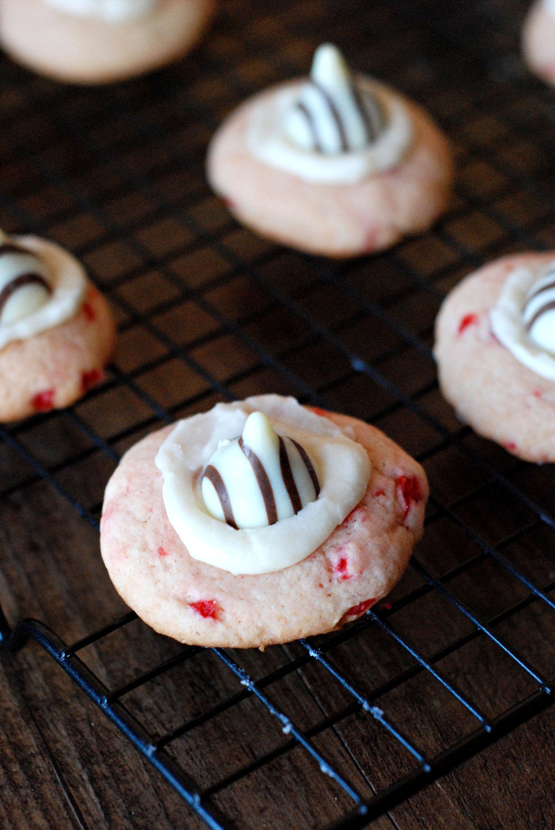 Sweet little cherry thumbprints with vanilla filling and a little Hershey Kiss!