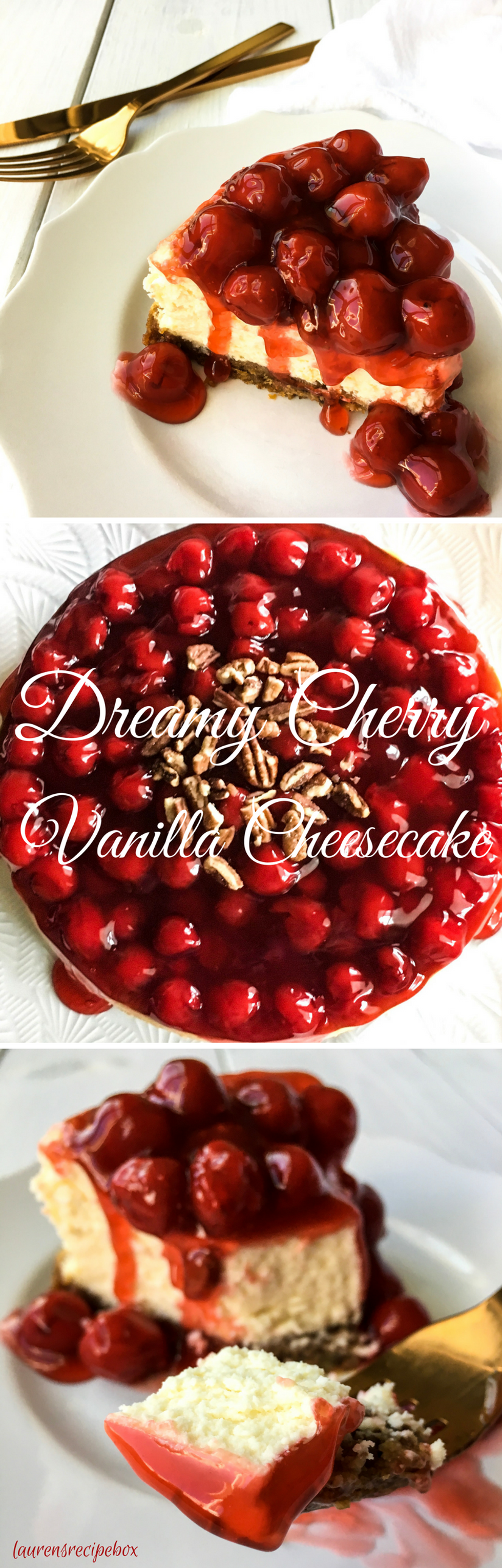 Luxurious and dreamy vanilla cheesecake smothered in cherries on a cinnamon graham cracker crust.