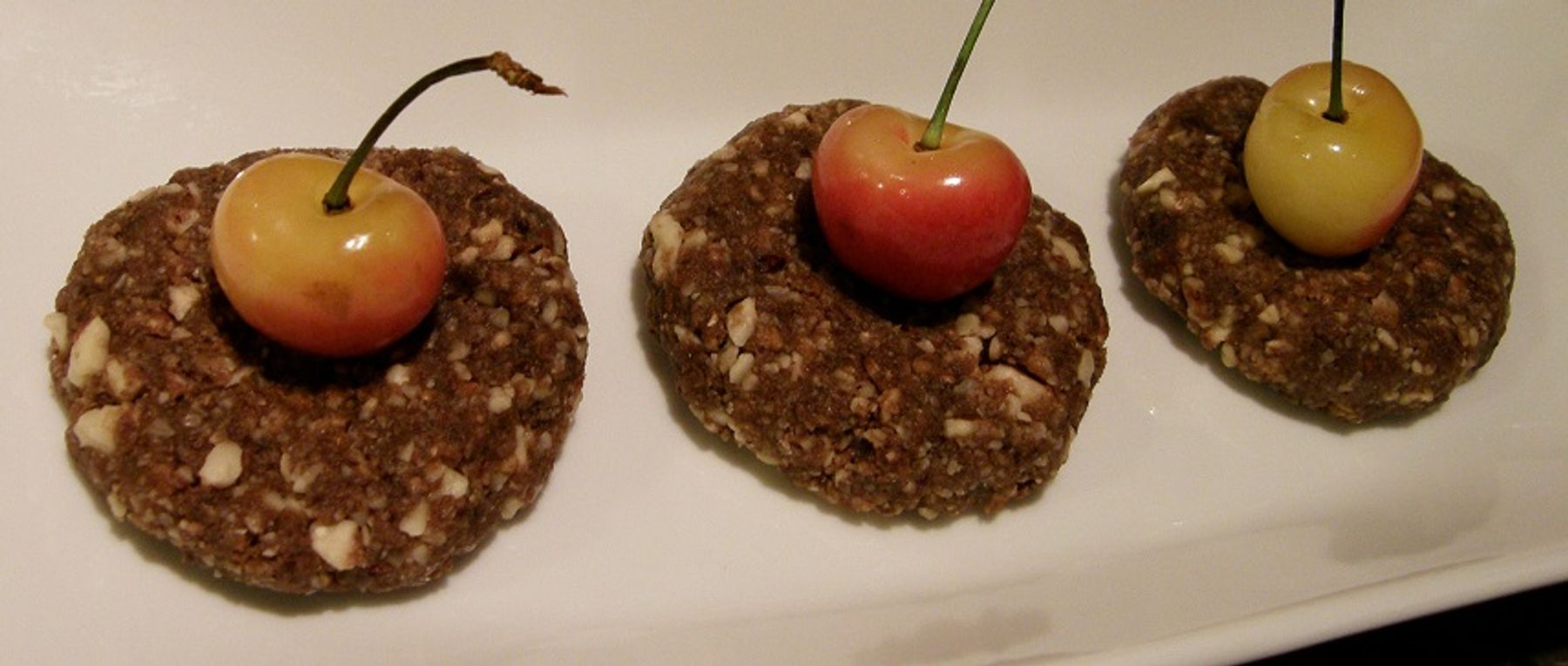 Put the 4 deseeded cherries, walnut, almond, dates, and cacao powder in a blender. Blend until well-mixed.