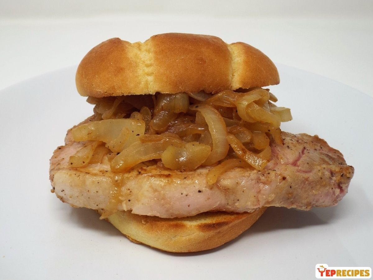 Pan fried onions and bone-in (yes, bone-in) pork chops served on hamburger buns.