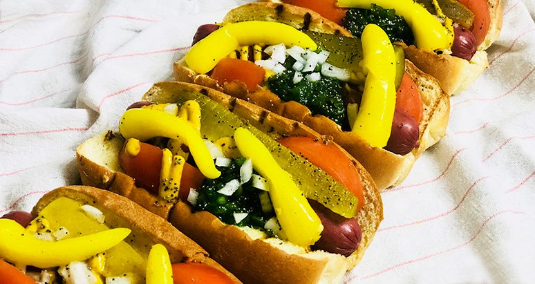Feel like you are at a ballgame by making your own Chicago Style hot dogs. This recipe features Fullblood Wagyu beef hot dogs, topped with tomato, pickle, yellow mustard, onions, relish, banana peppers, and celery salt. These delicious hot dogs are quick, simple, and sure to be the new family favorite!